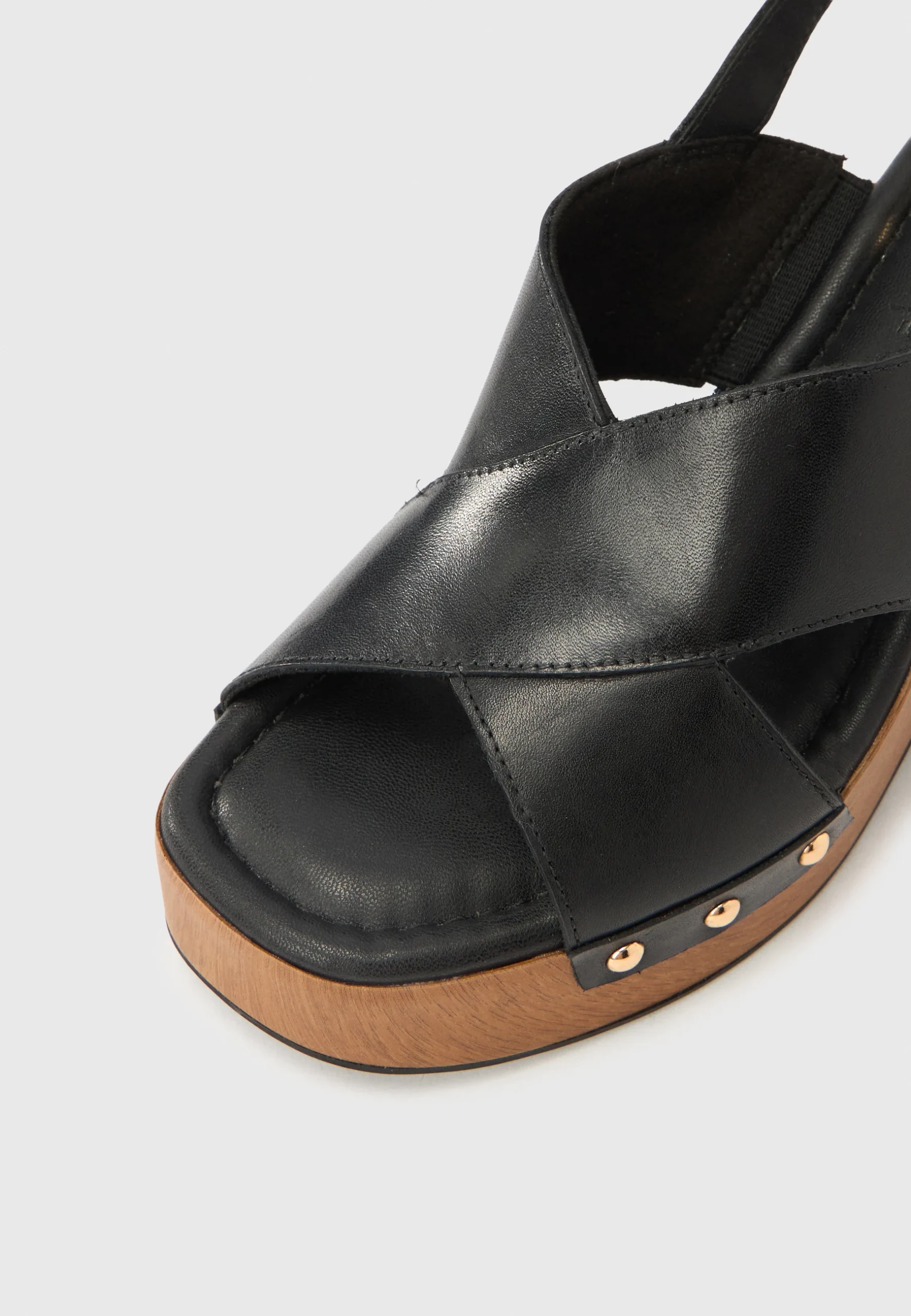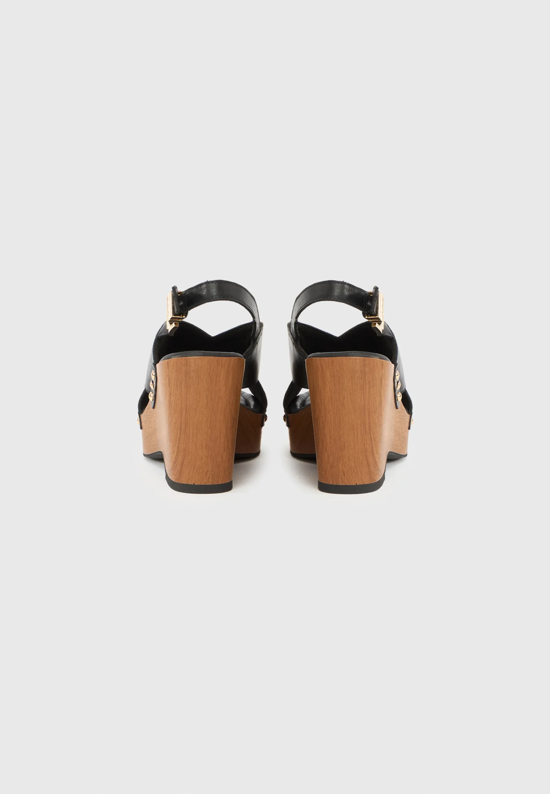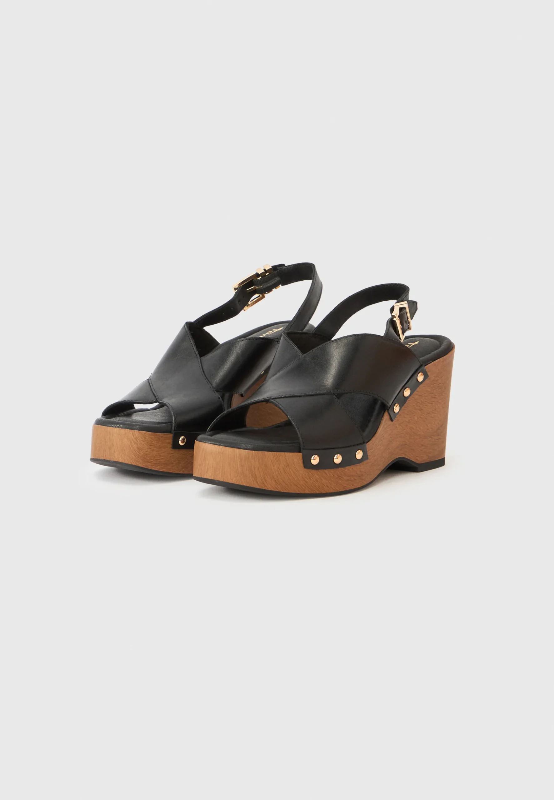 Con suola in gomma e punta quadrata, questi sandali con zeppa sono l'accessorio must-have di questa stagione. Ampi cinturini incrociati in pelle liscia, impreziositi da borchie dorate, aggiungono un tocco di carattere e stile. Una fibbia Maje garantisce una calzata discreta alla caviglia.