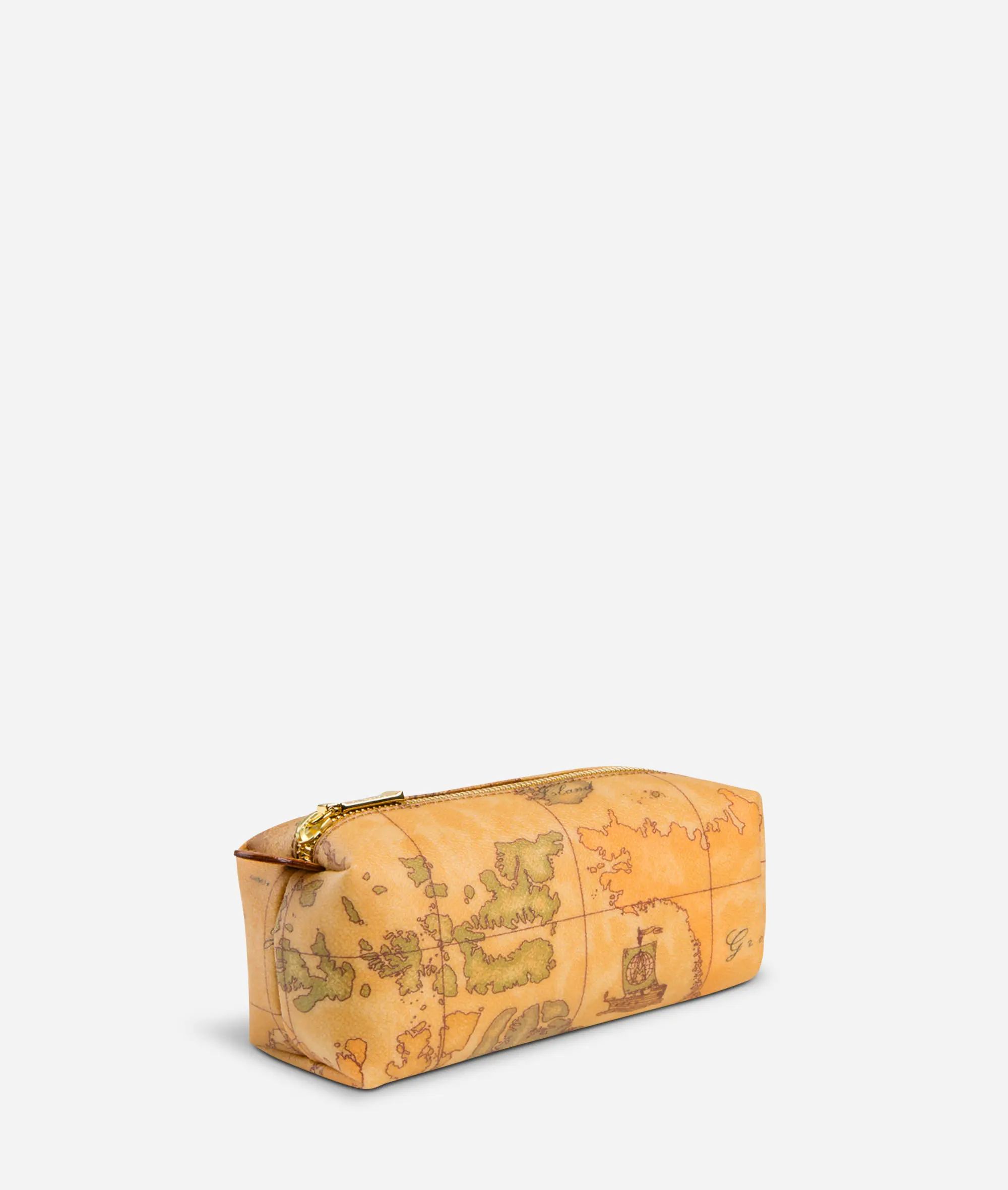 Astuccio in tessuto stampato con cartina geografica Geo Classic dalla linea squadrata, con dettagli in pelle di vacchetta color cuoio, chiuso con zip. Ideale da portare in borsa o da regalare a una persona speciale.