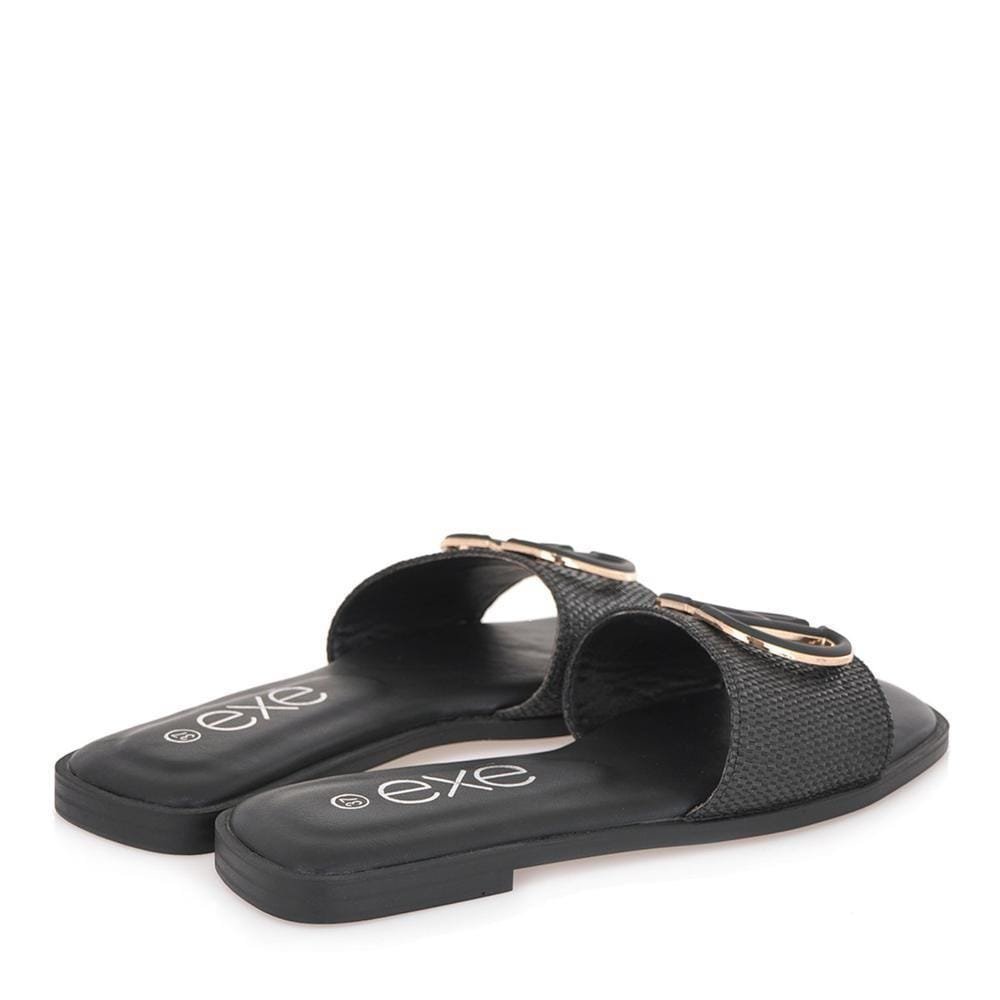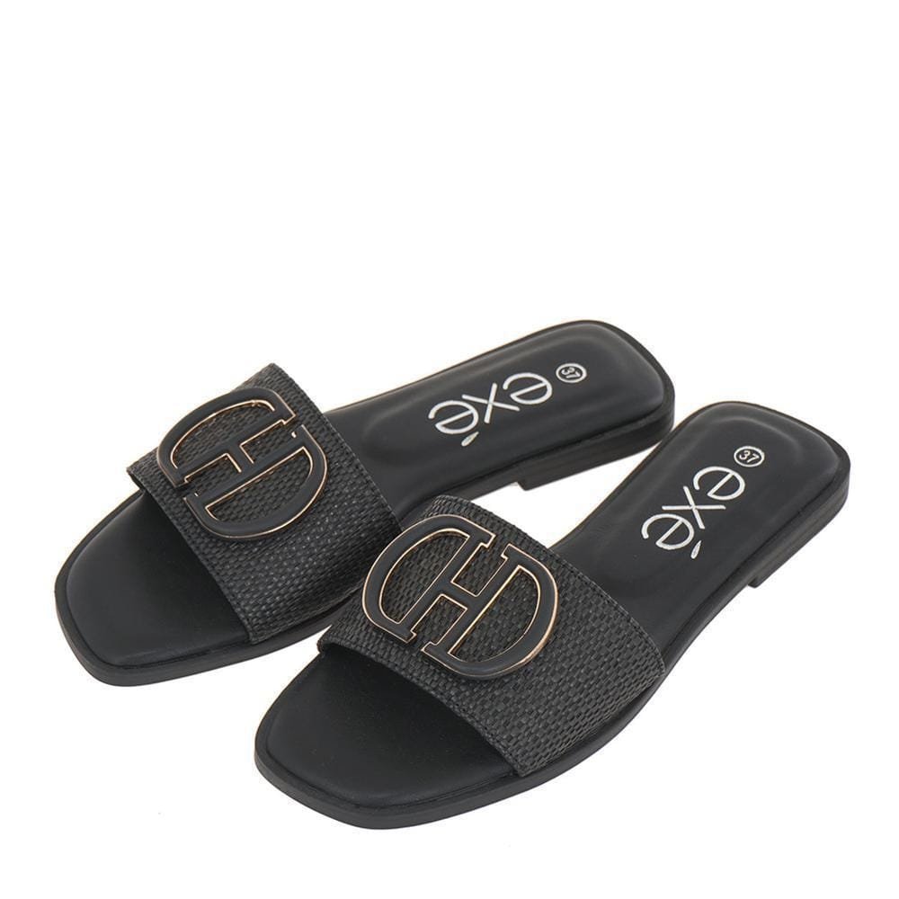 Questi sandali bassi neri con finiture dorate uniscono la raffinatezza della tonalità scura a tocchi di luce che donano al design un'aria chic e contemporanea.