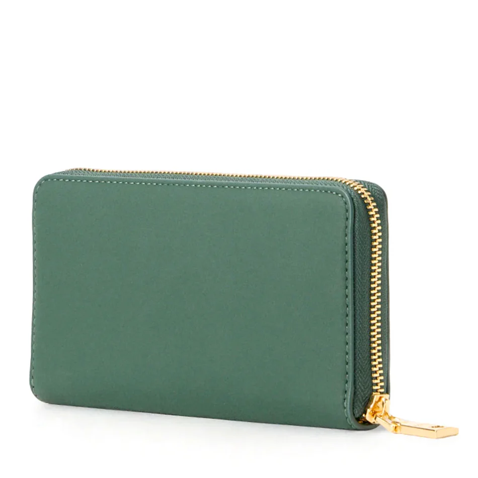 Portafoglio in similpelle, chiusura con cerniera lampo, metallica in argento.