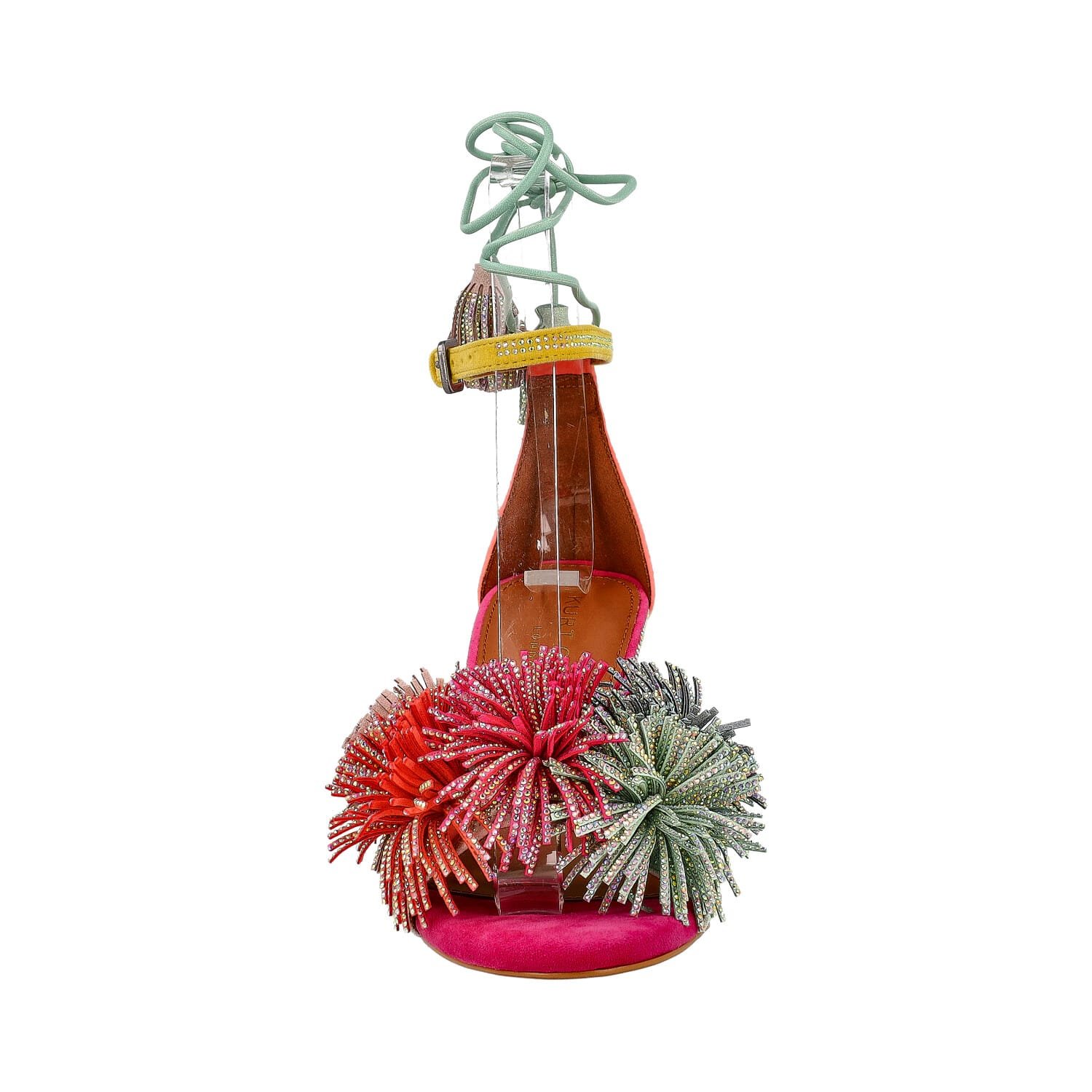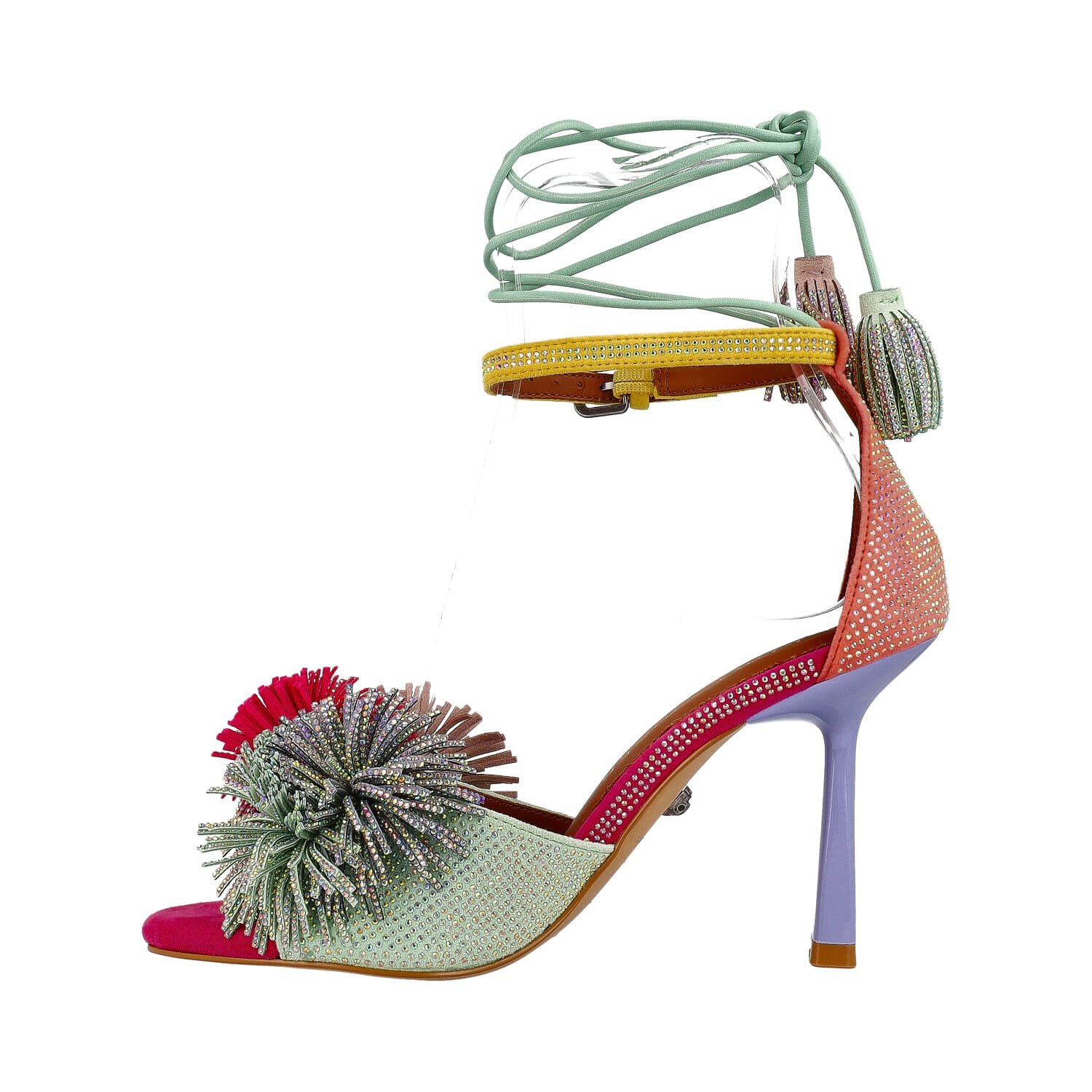Realizzato in suede con applicazioni di strass, questo sandalo conquista subito per la sua anima luminosa e sofisticata. La tomaia aperta sulla punta è impreziosita da maxi dettagli decorativi pom pom gioiello multicolor, che regalano movimento, luce e personalità alla scarpa. Il mix cromatico acceso e raffinato rende questo modello ideale per completare outfit eleganti, look da cerimonia o abbinamenti fashion più audaci.
