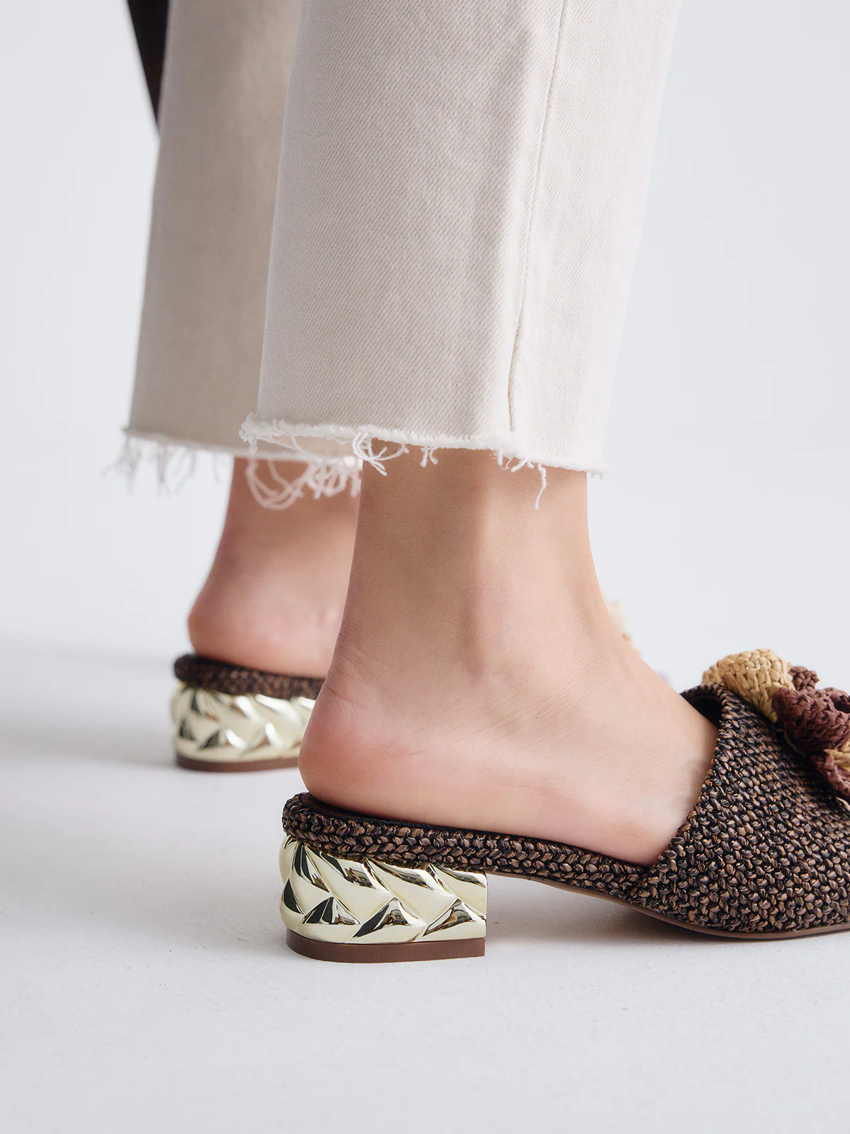 La raffinatezza può anche essere leggera e naturale. Questi sandali con tacco basso in rafia marrone uniscono delicatezza, tendenza e comfort in un design perfetto per gli ospiti che cercano stile senza eccessi.
