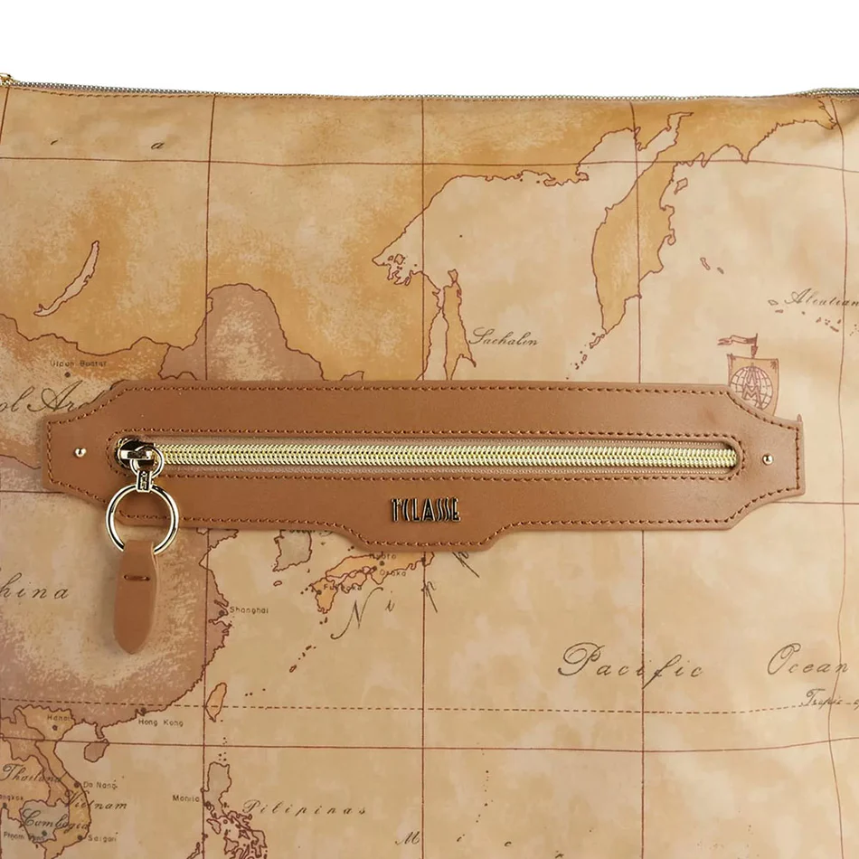 Sottospalla in tessuto soft stampa Geo Classic chiusa con zip. Inserti in pelle color cuoio. Spallaccio in nastro logato 1ᴬ Classe scorrevole sui lati per la portabilità a zaino.
