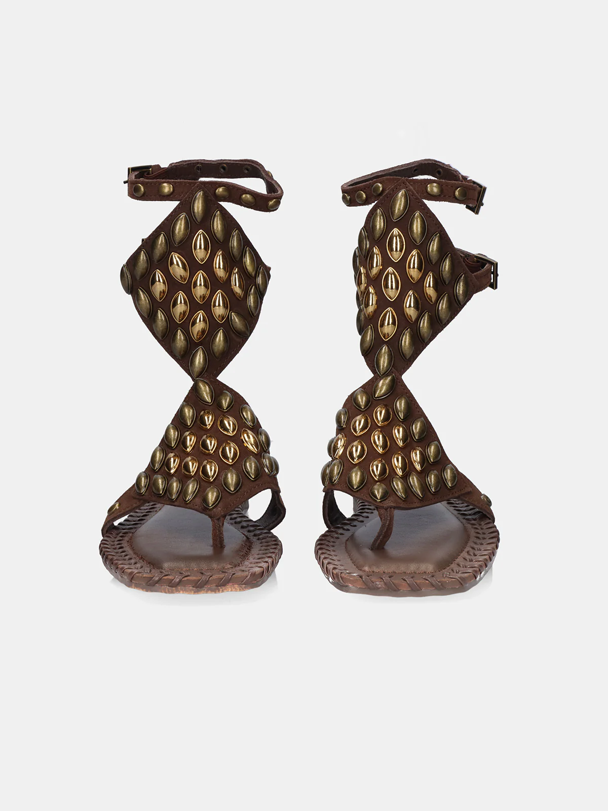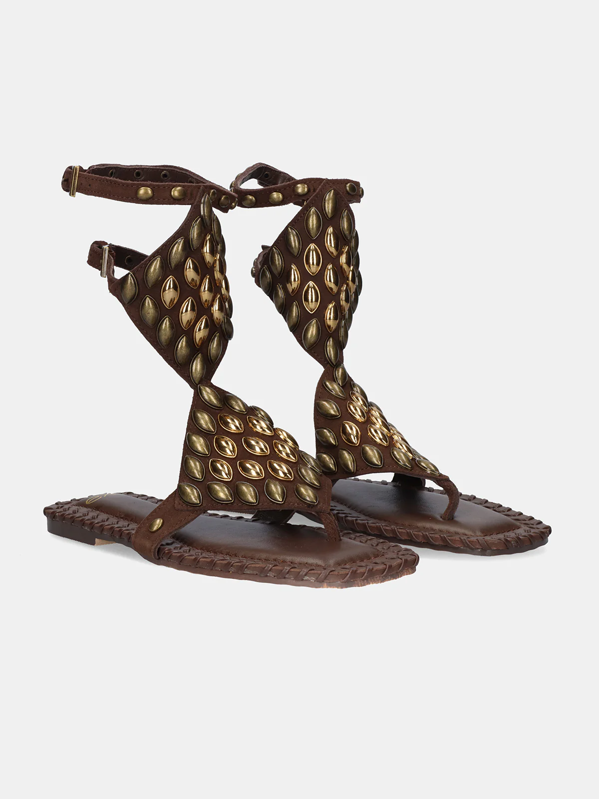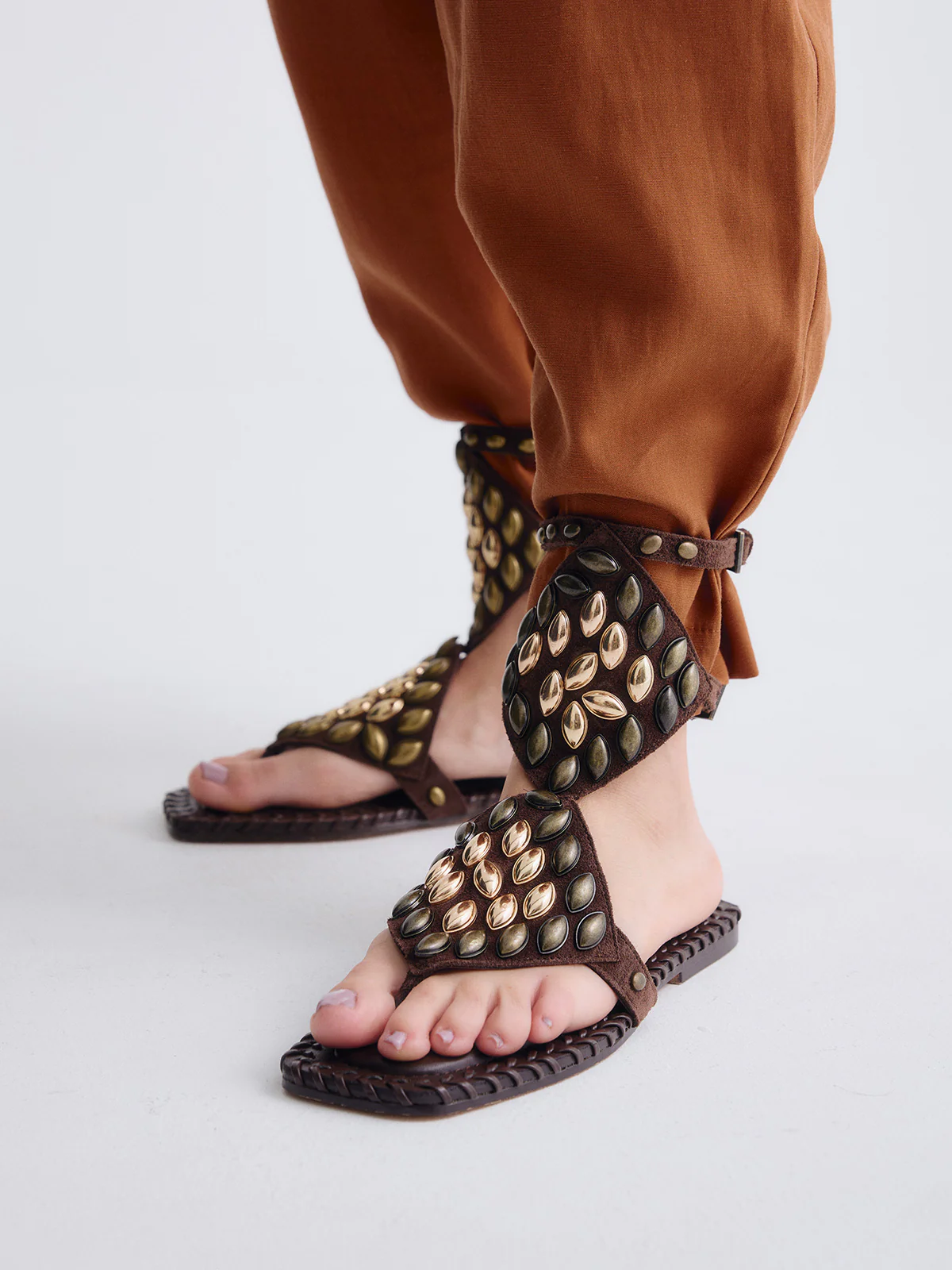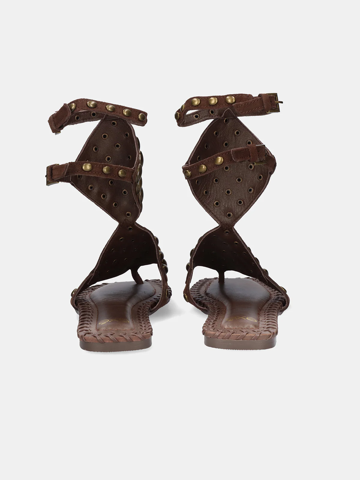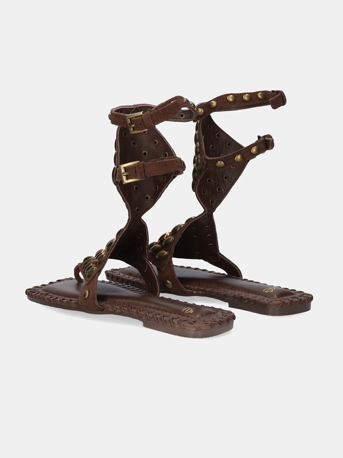 Carattere e naturalezza in perfetto equilibrio. Questi sandali bassi in pelle marrone con borchie reinterpretano un classico con un tocco moderno e pieno di personalità.