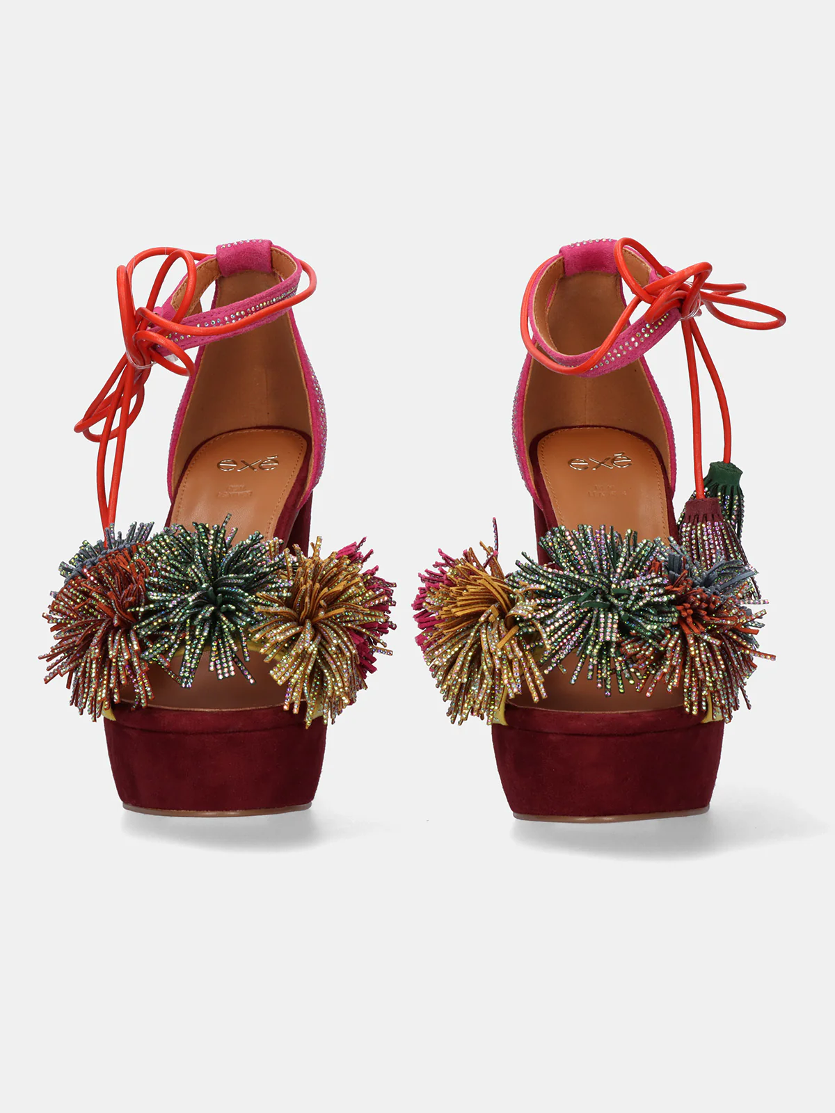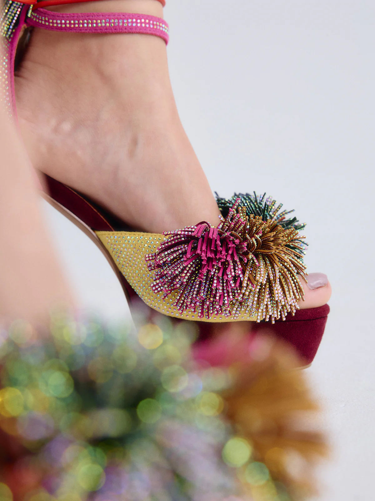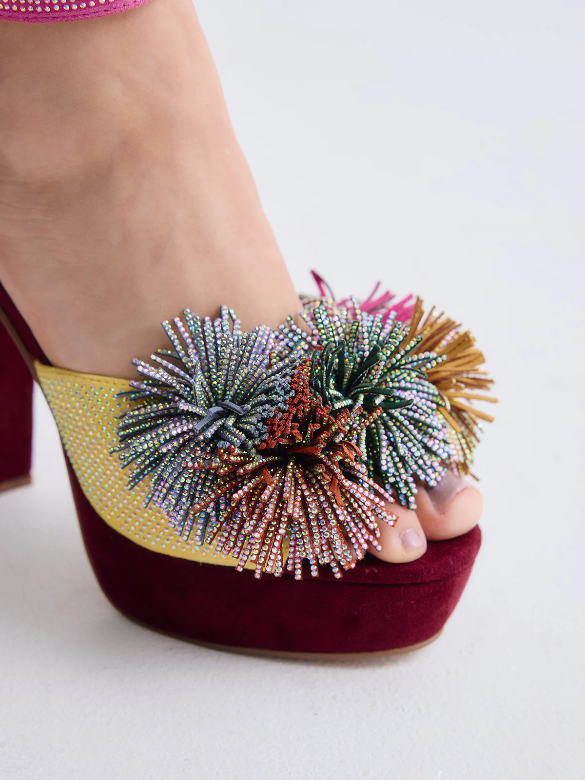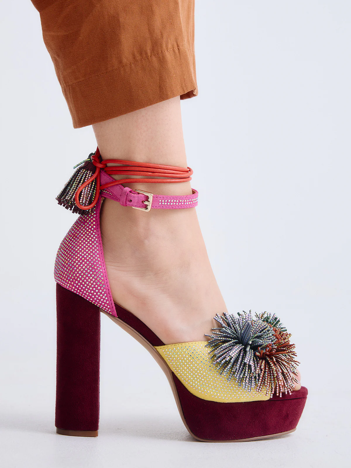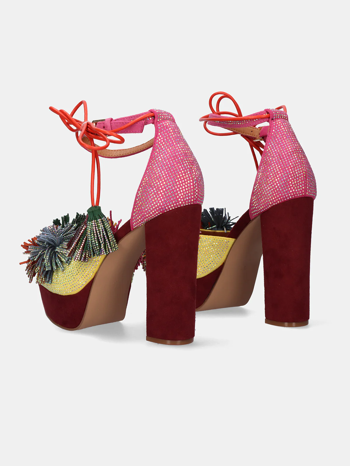 Perfetti per dare vita agli outfit estivi e trasformare ogni passo in una dichiarazione di stile. Questi sandali con tacco combinano tonalità rosa e gialle con due pompon scintillanti che aggiungono un tocco giocoso e sofisticato allo stesso tempo.