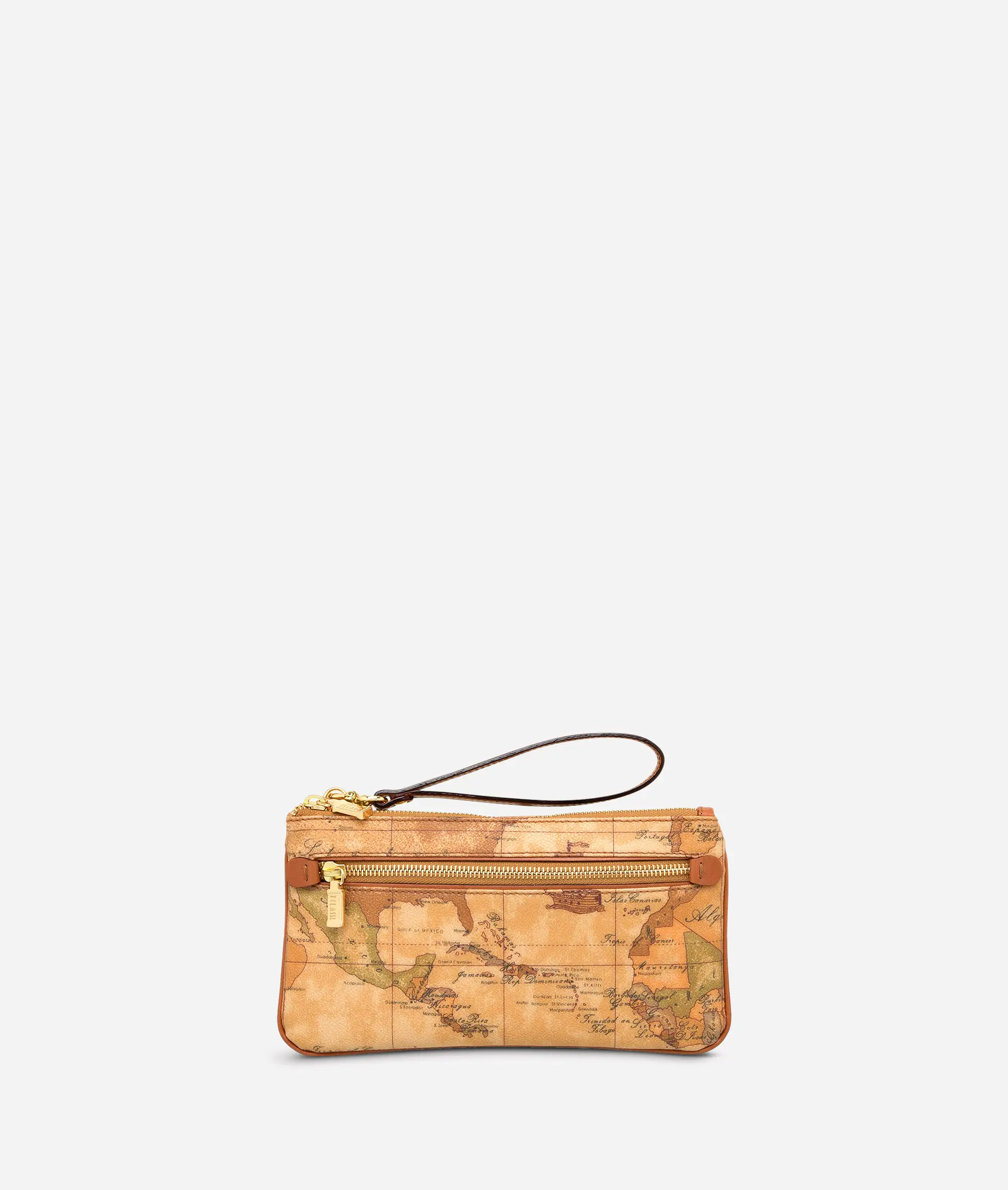 Pochette in tessuto stampato con cartina geografica Geo Classic con tasca frontale chiusa con zip, occhiello removibile in pelle color cuoio, chiusura con zip. Capiente e discreta, conterrà senza problemi tutto ciò che ti serve.