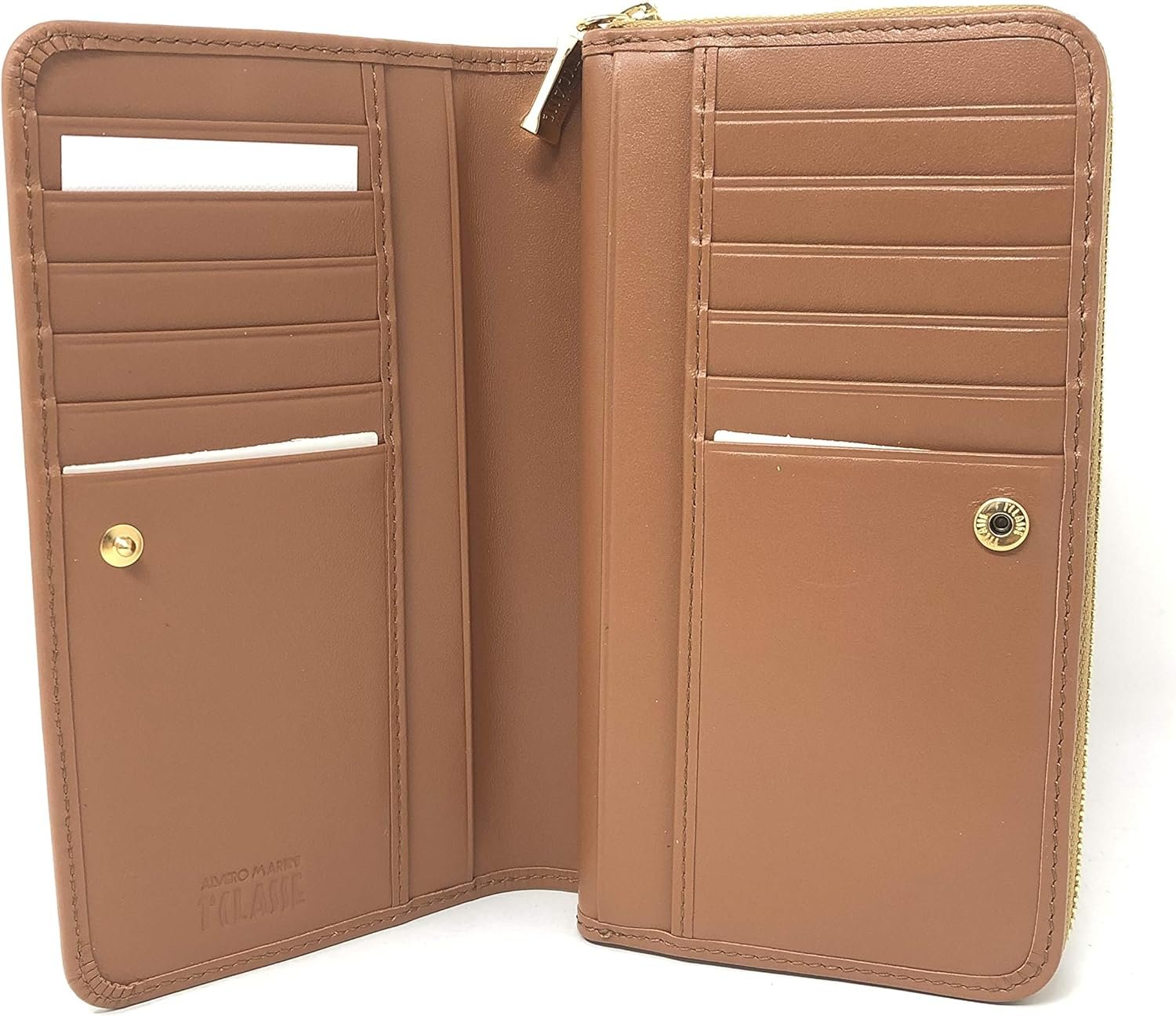 con tasca esterna chiusa con zip, tasca zip around per banconote e carte di credito,